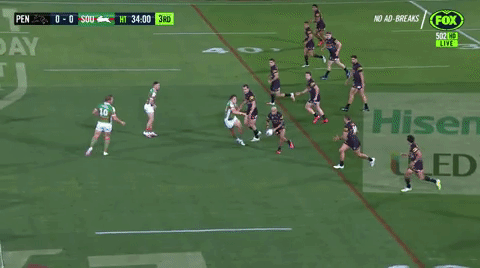Jarome Luai looks a completely different player when playing alongside Nathan Cleary, and the live-wire half toyed with Souths’ right edge early on, setting Kikau free in yardage sets to either run or pass to great effect: