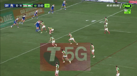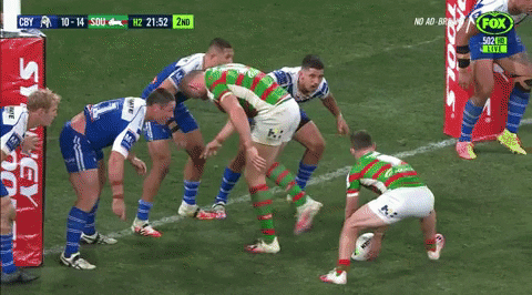 Gifted a fresh set on the Bulldog’s line, Souths head left to the posts through Burgess, with Murray running the lead decoy line. Burgess almost crashes over, dragging five Dog’s players into the tackle: