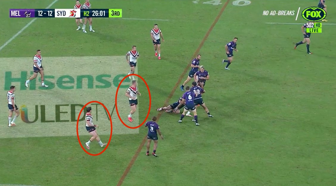 After defending their goal line against consecutive sets, Sydney feed a scrum on their 10 meter line and begin working upfield. As we’ve seen time and again through Luke Keary and James Tedesco, the Roosters are unafraid to chance their arm coming out their own end:
